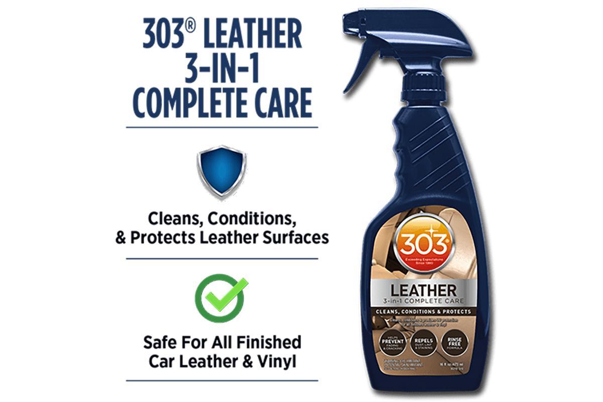 The 303 Automotive Leather 3 in 1 Complete Care will clean, condition, and protect your leather and vinyl pieces in one simple formula. Spray this product onto the surface and wipe away any residue. 303 Automotive Leather 3 in 1 will help clean the surface from any dirt and grime with ease. For any heavily contaminated areas let it dwell before wiping away. Once you are finished the unique formula will have cleaned the surface and left the seats conditioned so they feel soft and supple. It will also leave behind a nice layer of protection to help protect your seats from future dirt, grime, lint, stains, and harmful UV rays that can cause leather seats to crack and fade. The dry, matte looking finish left behind is great and you will not be left with any greasy look or feel. If you are looking for one product to clean, condition, and protect your seats, the 303 Automotive Leather 3 in 1 Complete Care is the product for you!Made in the USA