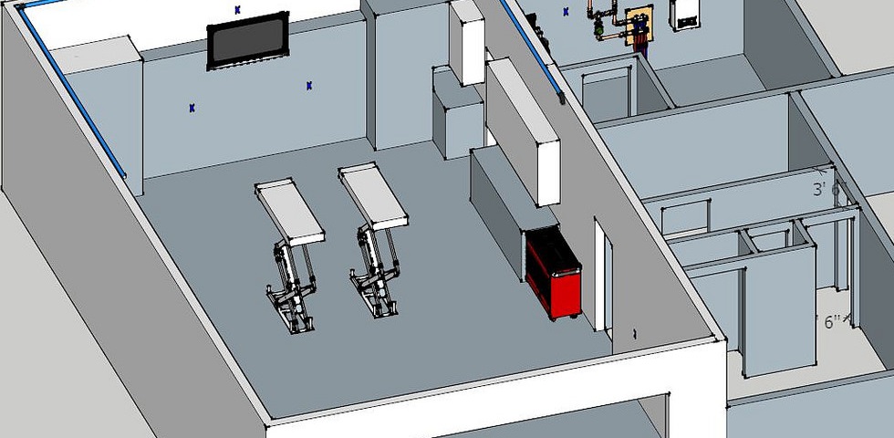 Consider utilizing CAD tools to design aspects of your project. I’m fortunate to work on CAD in my full time career; however, the best visual/design tool I used was a free online software program anyone can use, called Google SketchUp. In the images below, you can see how I drew up the floor plan in 3D. The program also had endless models to import when figuring out how to place the things I wanted (toolbox, cabinets, lift station, TV, outlets, etc.) for space planning, while also making my workflow more effective and efficient. Heck, I even used it to layout the framing of our walls and window placement for the bedroom addition. 🙂