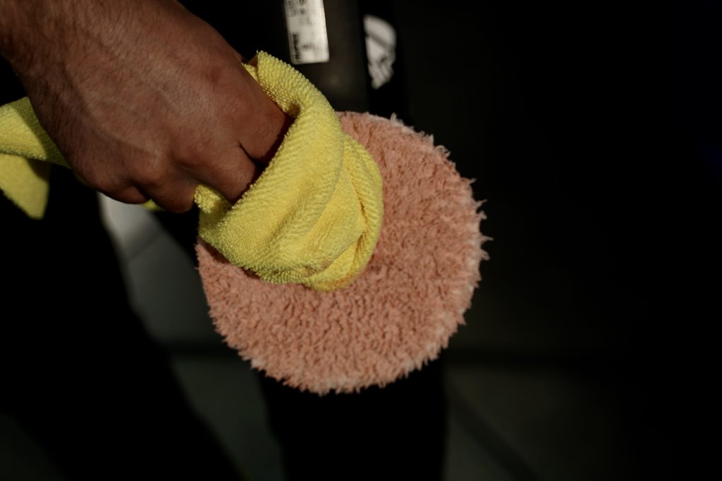 1. Grab a microfiber towel and firming hold it in one hand. Place your machine in the other hand and run the towel over the face of the pad. The microfiber will pick up any polishing residue and clean the pad for the next cycle.