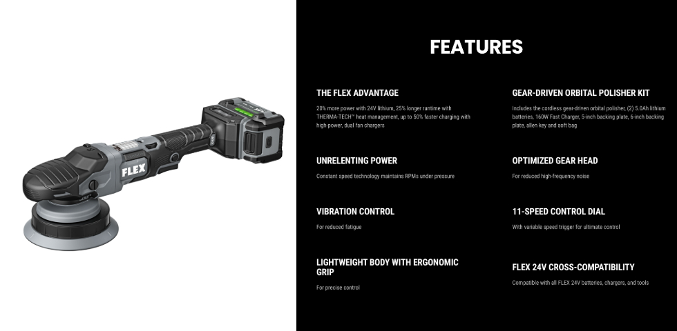 Take on a wide range of polishing job from heavy-duty material removal to delicate finishing work with the FLEX 24V Gear-Driven Orbital Polisher. This cordless gear-driven orbital polisher can aggressively remove material with constant speed technology for unrelenting power that can maintain high RPMs under pressure. Its optimized gear head reduces high-frequency noise and vibration control reduces fatigue. This battery-powered orbital polisher features a lightweight body with an ergonomic grip plus an 11-speed control dial with a variable speed trigger for ultimate control. This cordless orbital polisher delivers the FLEX Advantage of unmatched battery power, runtime, and fast charging. Kit includes the 24V gear-driven orbital polisher, (2) 5.0Ah lithium batteries, 160W Fast Charger, 5-inch backing plate, 6-inch backing plate, and an Allen key. It’s all protected by the FLEX Limited Lifetime Warranty when registered within 30 days of purchase at registermyFLEX.com through December 31, 2024.