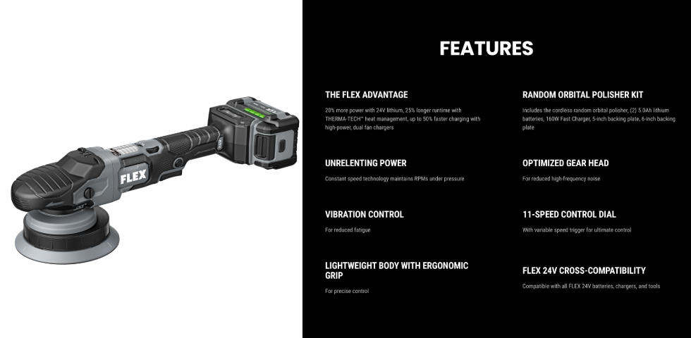 Put the finishing touches on polishing work with the FLEX 24V Random Orbital Polisher. This cordless random orbital polisher removes material with constant speed technology for unrelenting power that can maintain high RPMs under pressure, delivering up to 4,350 RPM and 8,700 OPM. Its optimized gear head reduces high-frequency noise and vibration control reduces fatigue. This battery-powered rotary polisher features a lightweight body with an ergonomic grip plus an 11-speed control dial with a variable speed trigger for ultimate control. This cordless rotary polisher delivers the FLEX Advantage of unmatched battery power, runtime, and fast charging. Kit includes the 24V random orbital polisher, (2) 5.0Ah lithium batteries, 160W Fast Charger, allen key, 5-inch backing plate, and 6-inch backing plate. It’s all protected by the FLEX Limited Lifetime Warranty when registered within 30 days of purchase at registermyFLEX.com through December 31, 2024.