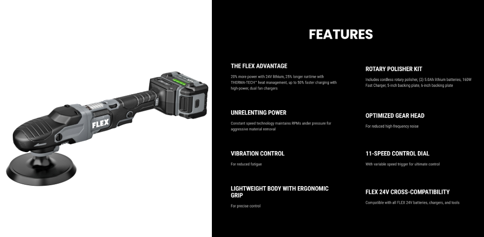 Cut through clear coat to aggressively remove defects like rock chips, orange peel, swirl marks, and other imperfections with the FLEX 24V Rotary Polisher. This cordless rotary polisher aggressively removes material with constant speed technology for unrelenting power that can maintain high RPMs under pressure. Its optimized gear head reduces high-frequency noise and vibration control reduces fatigue. This battery-powered rotary polisher features a lightweight body with an ergonomic grip plus an 11-speed control dial with a variable speed trigger for ultimate control. This cordless rotary polisher delivers the FLEX Advantage of unmatched battery power, runtime, and fast charging (batteries and chargers sold separately). Kit includes the 24V rotary polisher, (2) 5.0Ah lithium batteries, 160W Fast Charger, 5-inch backing plate, and 6-inch backing plate. It’s all protected by the FLEX Limited Lifetime Warranty when registered within 30 days of purchase at registermyFLEX.com through December 31, 2024.
