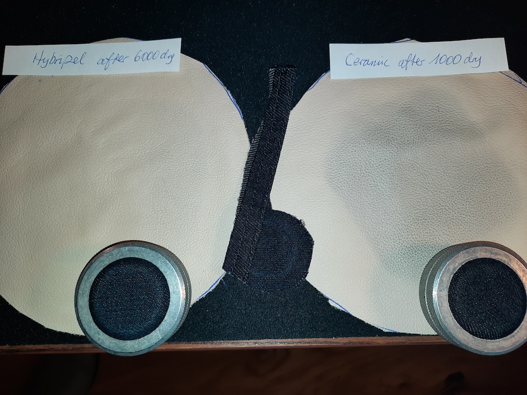 Particle coatings (e.g. ceramic or silica) can reduce friction between a textile and the seat surface so perform quite well in tests when the surface remains dry. Less dye is rubbed off. When however, sweat or moisture are present, particle coatings rapidly lose their functionality, and dyes freely penetrate the surface.