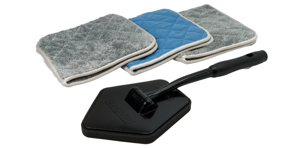The Autofiber Reacher Tool is a specialized cleaning tool that combines a sturdy handle with the Autofiber Flip or Double Flip microfiber towels. The handle measures 15 inches for extra reach and the Flip towels are stitched specifically so that you can easily slide the mitt over the head of the Reacher Tool. There are many different Flip and Double Flip towel options, some for glass cleaning, others not, but the two options we recommend are the: