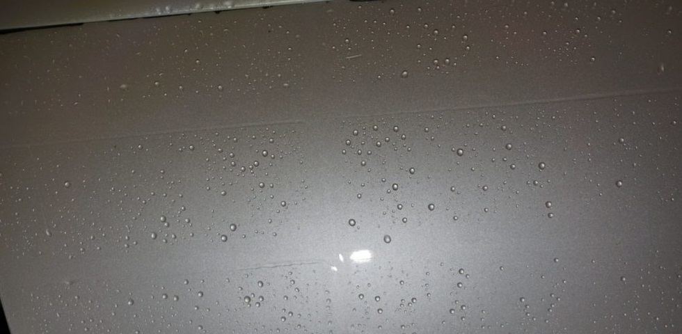 Here are some photos of the PPF before washing. You can pretty easily see the tape lines and where the PPF was not protected. The beading properties after about 3 months of constant abuse are also photographed below. Notice the water sitting stagnant on the edges of where the tape was, now bare PPF. This was really hard to photograph due to being white paint, so hopefully, you can get a decent idea of what’s going on.