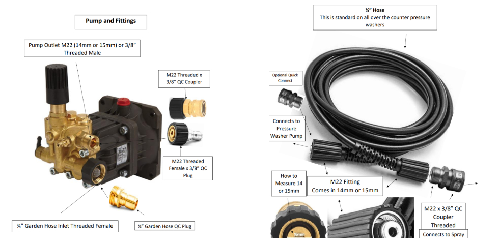The 14mm Adapter Kit includes 2x stainless garden hose plugs (for pressure washer inlet and garden hose spray gun), 1x stainless garden hose coupler (for garden hose outlet), 2x stainless 3/8 QC coupler X 14mm M22 plug (for hose ends), 2x stainless 3/8 QC Plug X 14mm M22, and 1x coupler (for pump outlet and OEM gun Inlet). Generally these adapters work with Ryobi, Simpson, Karcher and Kranzle pressure washers.
