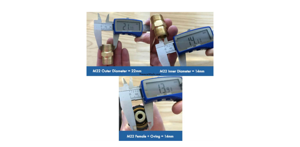 M22 threads are common on pumps, hoses and spray guns. Below is a photo showing the measurements of these fittings. The outer diameter of the M22 is 14mm and the inner plug on the female side is 14mm. The female side has the o-ring to prevent leaking. Now, a different fitting can measure 15mm, so we have two different adapter kits to help you here.
