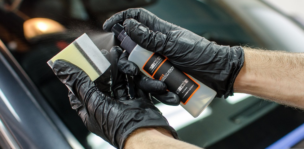 Once you are certain the glass is nice and clean, simply mist a small amount of VG1 onto the 22ple applicator and apply the product to the glass in straight line motions. I started with horizontal strokes followed by vertical strokes (cross hatch pattern) to ensure even coverage. I worked in small sections, and would apply more product to the applicator as needed until the area had been covered.