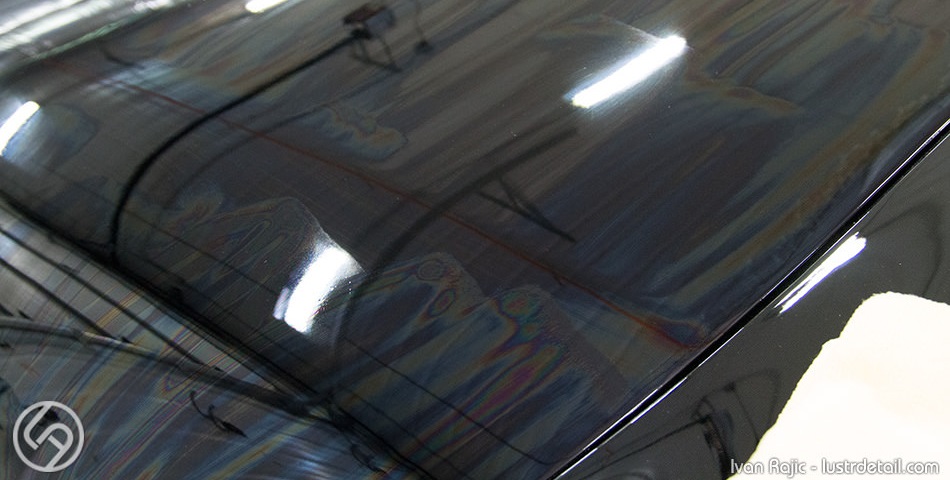 I’m starting here in the middle of the hood with the intent to do the quarter of it. You can see the small area to which I already applied some product is already showing the “new” characteristic of 22ple. It has a rainbow effect that starts a few seconds after the product is applied, so it’s extremely easy to see it even in poor lighting or lighter paint colors…