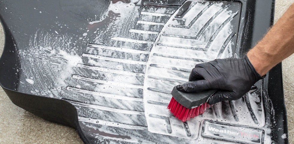 Once you have fully rinsed the mats, you will simply spray Mat Renew Floor Mat Cleaner & Protectant directly onto the mat. You then want to take a brush like the DI Carpet Scrub Brush to work loose any dirt, mud or grime that might be on the mats.