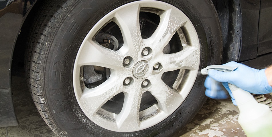 The P21S Gel Wheel Cleaner is a product I have used throughout my detailing career, both as an enthusiast and professional. It’s hard to find a better alternative because this cleaner is both safe and effective, without the harsh smell of some other wheel cleaners. One of my favorite things about P21S wheel cleaner is the fact that it foams up nicely and works effectively even when diluted 1:1 or 2:1 with water. Most of the vehicles we get at the shop require some level of brushing to remove the buildup, so the P21S wheel cleaner works well in that it foams up on the surface, breaks down the buildup and removes easily with a wheel brush. In the photos below, we had a newer Toyota Camry in for service and I wanted to show how well the P21S cleaner can work.
