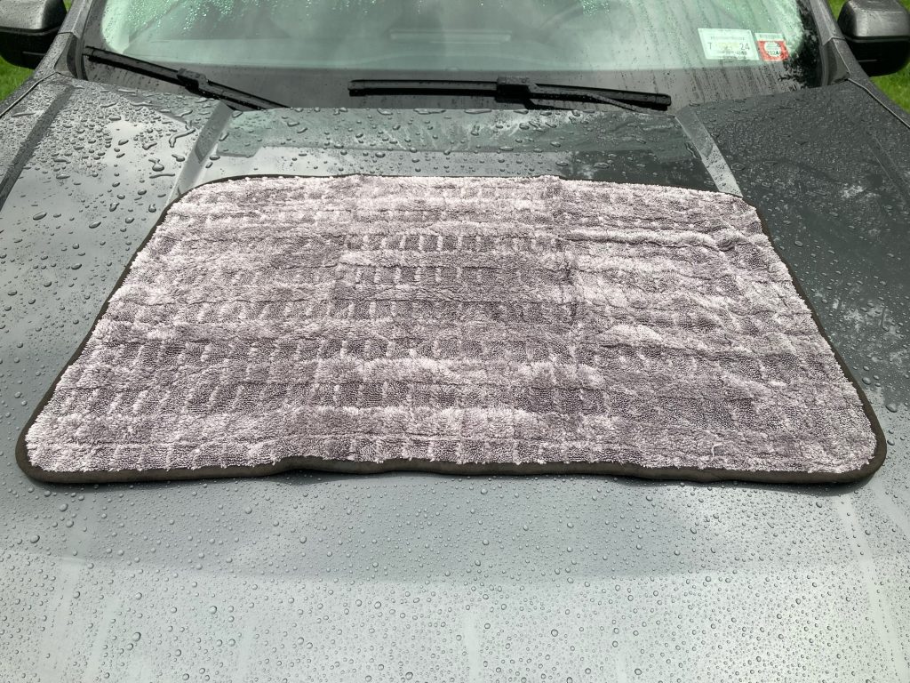 This towel comes in multiple different sizes and I had my hands on the 20″ x 30″, which I find is the perfect drying towel size. However, if you want something smaller they have a 12″ x 12″ and 15″ x 24″. Want something larger? No problem! Reach for the 30″ x 36″. The photo below shows off the 20″ x 30″ size and a single swipe to remove the standing water on the surface.