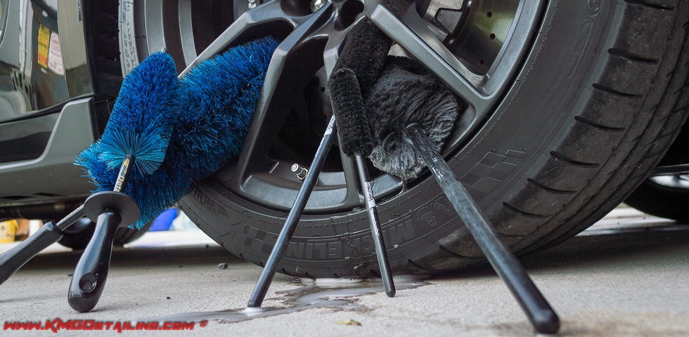 Next we have the DI EZ Detail Brushes, which is available in a full size brush measuring 18″ long by 4.5″ in round or the mini version that is 13″ long by 2.5″ round. Both of these brushes feature soft nylon bristles capable of cutting through even the heaviest dirt, while still be gentle enough for use on painted areas such as grille or door jambs. Any time I am working on a car with wheels that have a lot of tight spaces on them these are my go to brushes for cleaning. The tip of the brushes is covered with a vinyl tip nearly eliminating the risk of scratches or damage during use. The shaft of the brush also has a vinyl cover along with a very nice knuckle guard which is handy for use in engine bays and other areas where you are working around a lot of object. I find these brushes to be more versatile for tighter work spaces, however in my opinion they require a bit more agitation to fully clean as opposed to the Wheel Woolies.