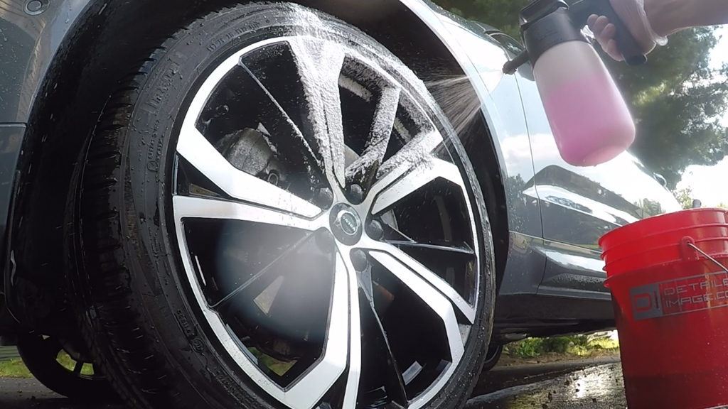 I started with P&S Brake Buster in a IK Foam 1.5 Sprayer for the cleaning. After giving it a good foaming, I scrubbed the tire with the Tuf Shine Tire Brush. For the wheels I used the DI Brushes Pro Series Wheel Brush and Detail Factory Wheel Brush.