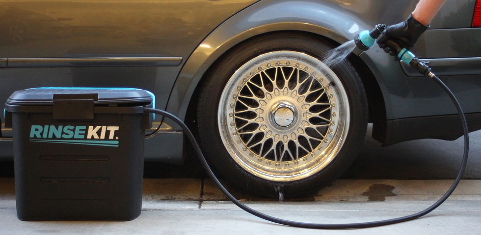 But then, surfers saved the day. I found this product invented by people who surf and need a “portable shower” to rinse off sand. This RinseKit is a 2-gallon chamber that is pressurized by the force of the water pumped into it, via garden hose, with a garden hose attachment on the end. So, you essentially have a hose with a 2-gallon water tank that requires no pumping. Now maybe 2 gallons isn’t enough to wash a car, but for wheels? Cowabunga dude.