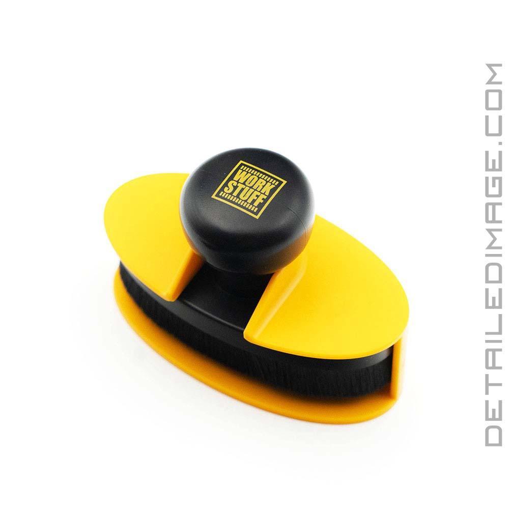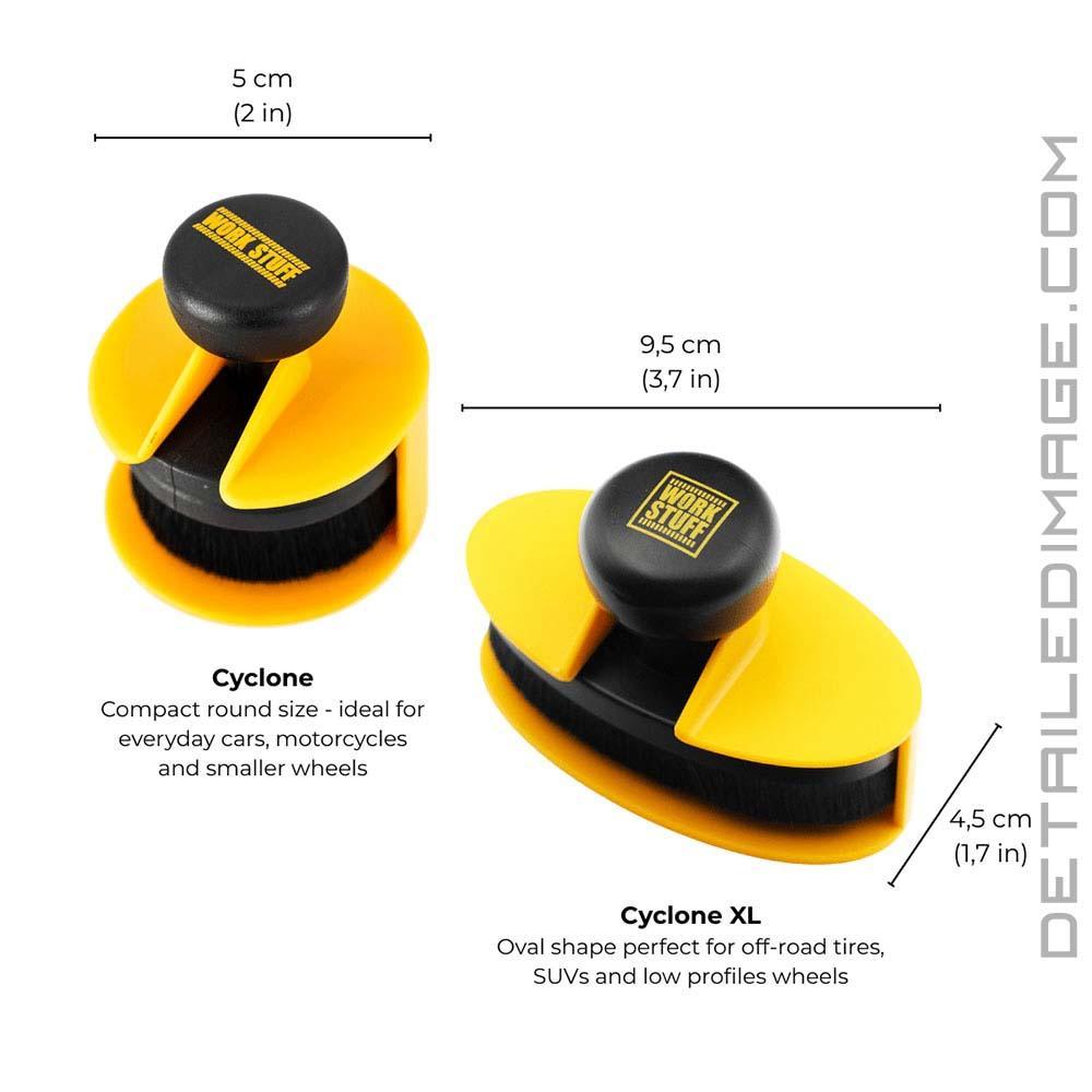The Work Stuff Cyclone Tire Brush Applicator helps anyone looking to enhance their tire protection routine. Its innovative brush design ensures even coverage of your favorite protection product, preventing streaks and smudges during the application process. Compatible with a variety of tire dressings, the Cyclone is built to last with durable construction and chemical resistant bristles that will not soak up excess product. This helps keep more product on the tips of the bristles, improving application and reducing product waste. The stamp-like handle design allows for an easy hold and maneuverability, keeping your hands clean during use. You can work on tires with various profiles and use all types of dressings: liquid, gel, or cream. After use, simply wash the brush with water and let it dry on the included stand. Save time and effort with the Work Stuff Cyclone Tire Brush Applicator, perfect for car enthusiasts, detailers, and DIYers alike!Measures - 2" in diameter